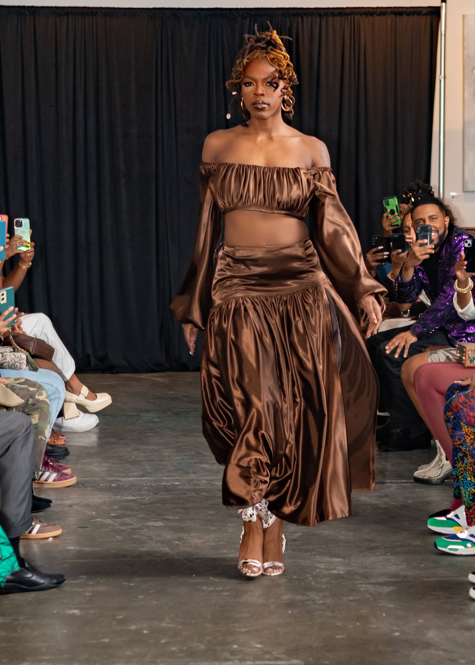 Radiate confidence and sophistication in the Bronze Goddess Two-Piece Set — a statement look from Mode718’s luxury women’s fashion collection. Expertly handcrafted from a one-way stretch brown shimmer sateen with a smooth satin lining, this design combines couture craftsmanship with modern sensuality.