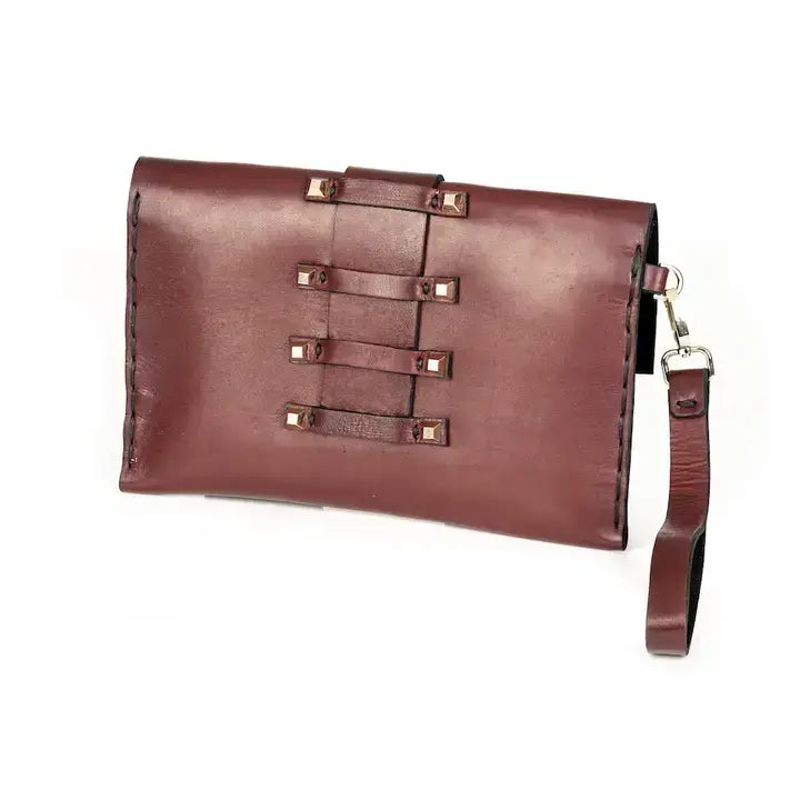 The Bordeaux Stud Clutch combines bold design with timeless sophistication. Handcrafted from genuine Italian leather in a rich, deep burgundy, this structured clutch commands attention with its sculptural silhouette, metallic stud detailing, and modern wrist strap — a perfect harmony of polished luxury and rebellious attitude.
