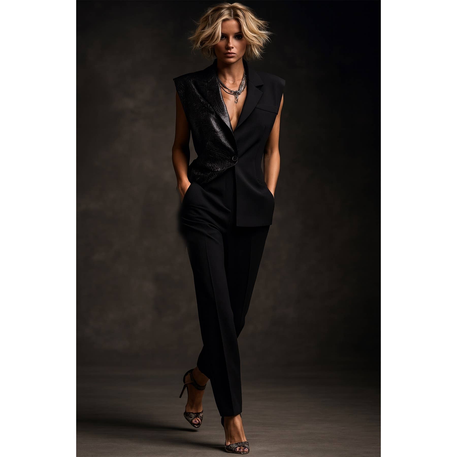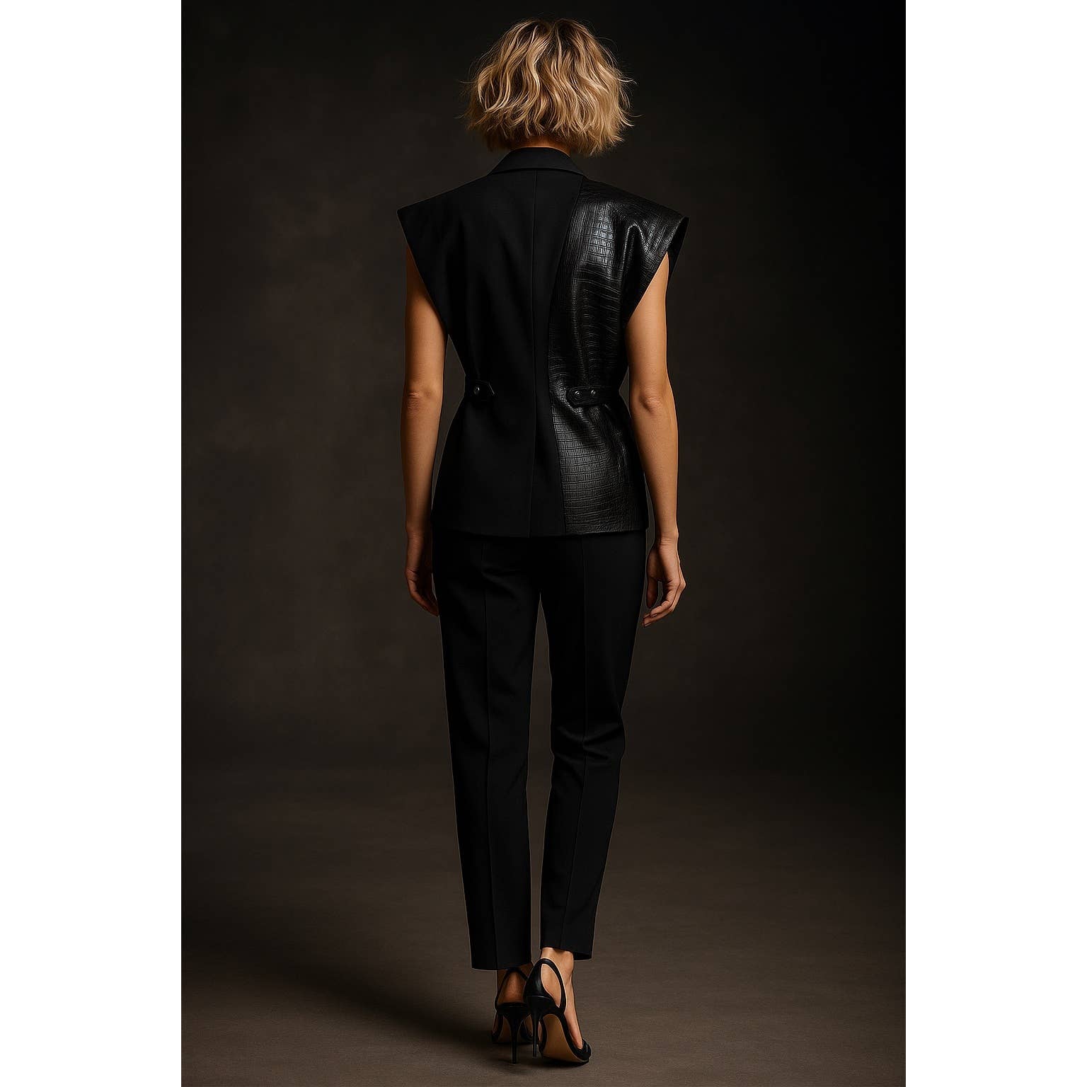 Step into commanding elegance with the Onyx Power Set, a modern tailored pantsuit designed for the woman who effortlessly owns every space she enters. The sleeveless blazer features a striking asymmetric construction, blending sharp suiting lines with a luxe textured leather panel for elevated contrast and visual impact.