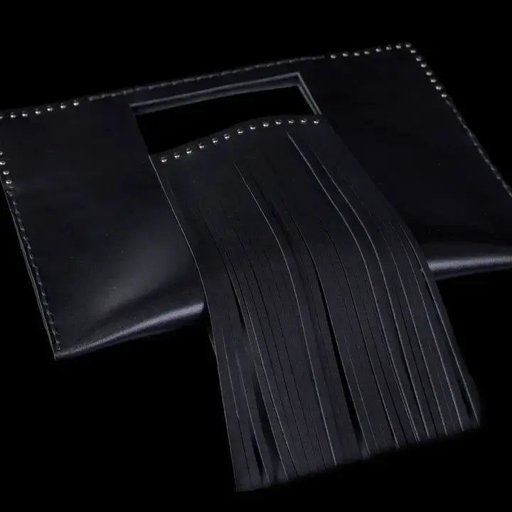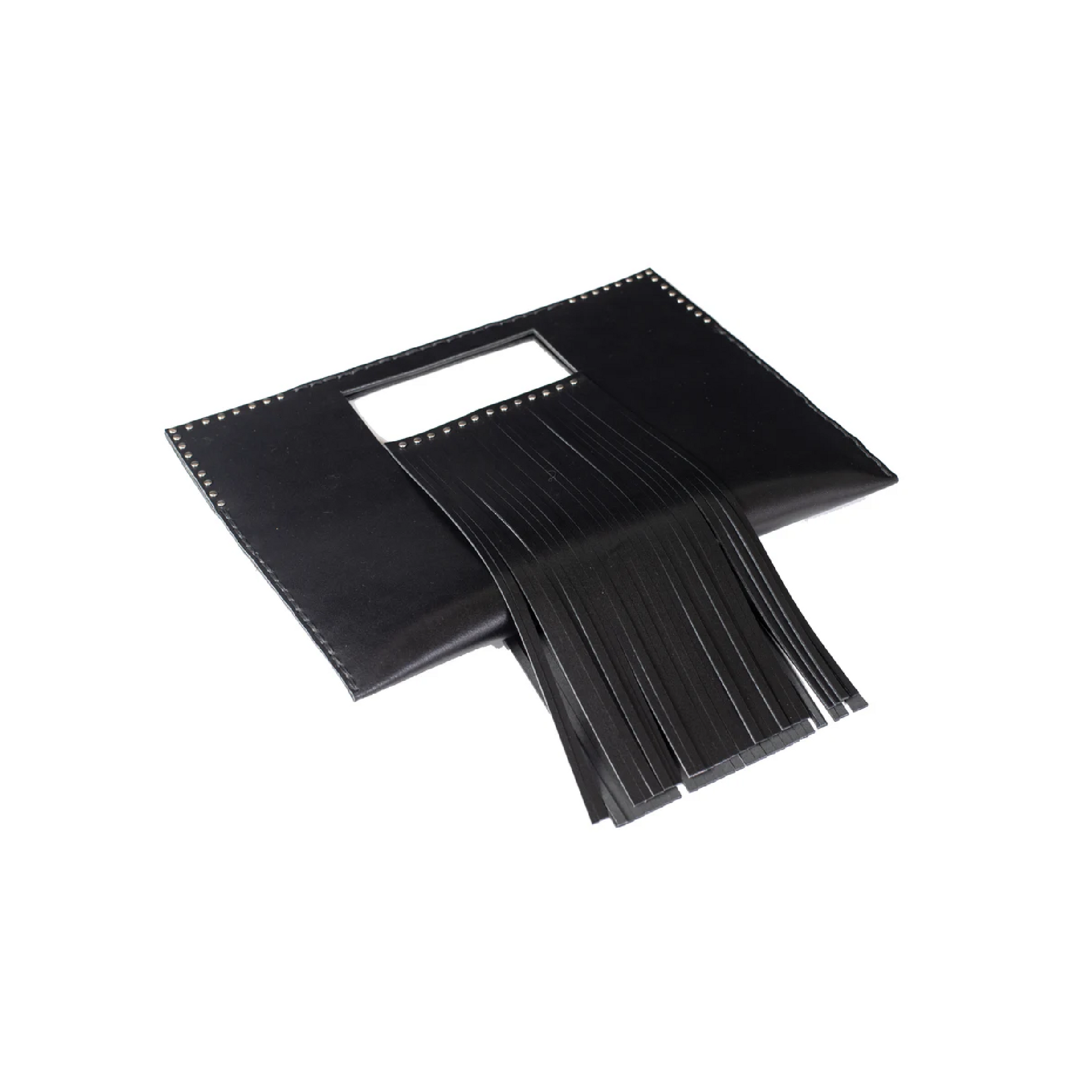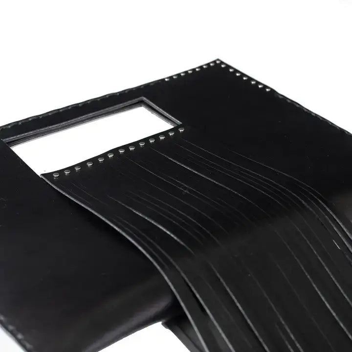 The square-cut handle introduces an element of architectural sophistication, while miniature metallic studs frame the silhouette, adding refined edge and underground glamour. Together, these elements transform The Fringe Affair into more than an accessory; it is an attitude, a presence, a moment.