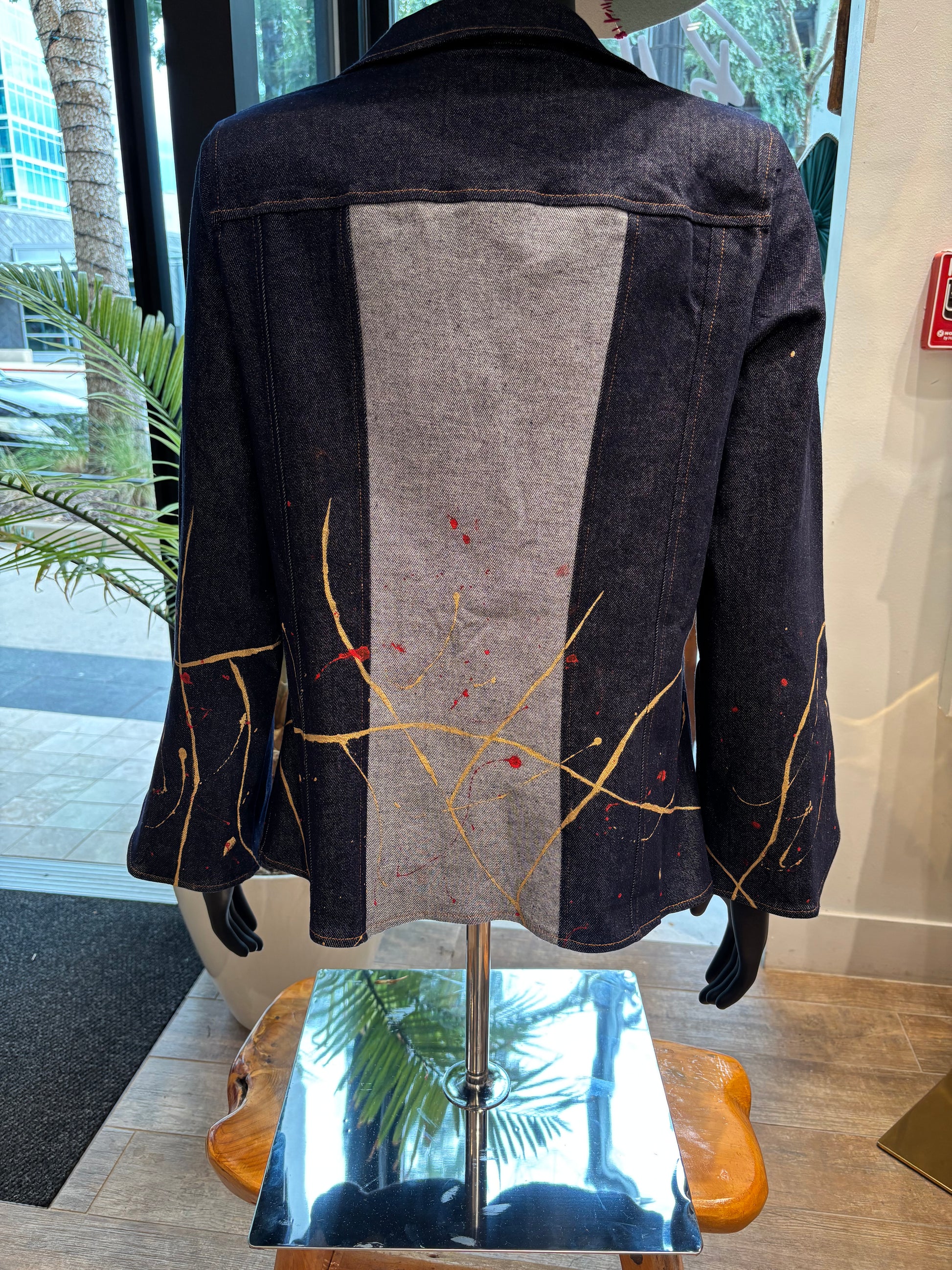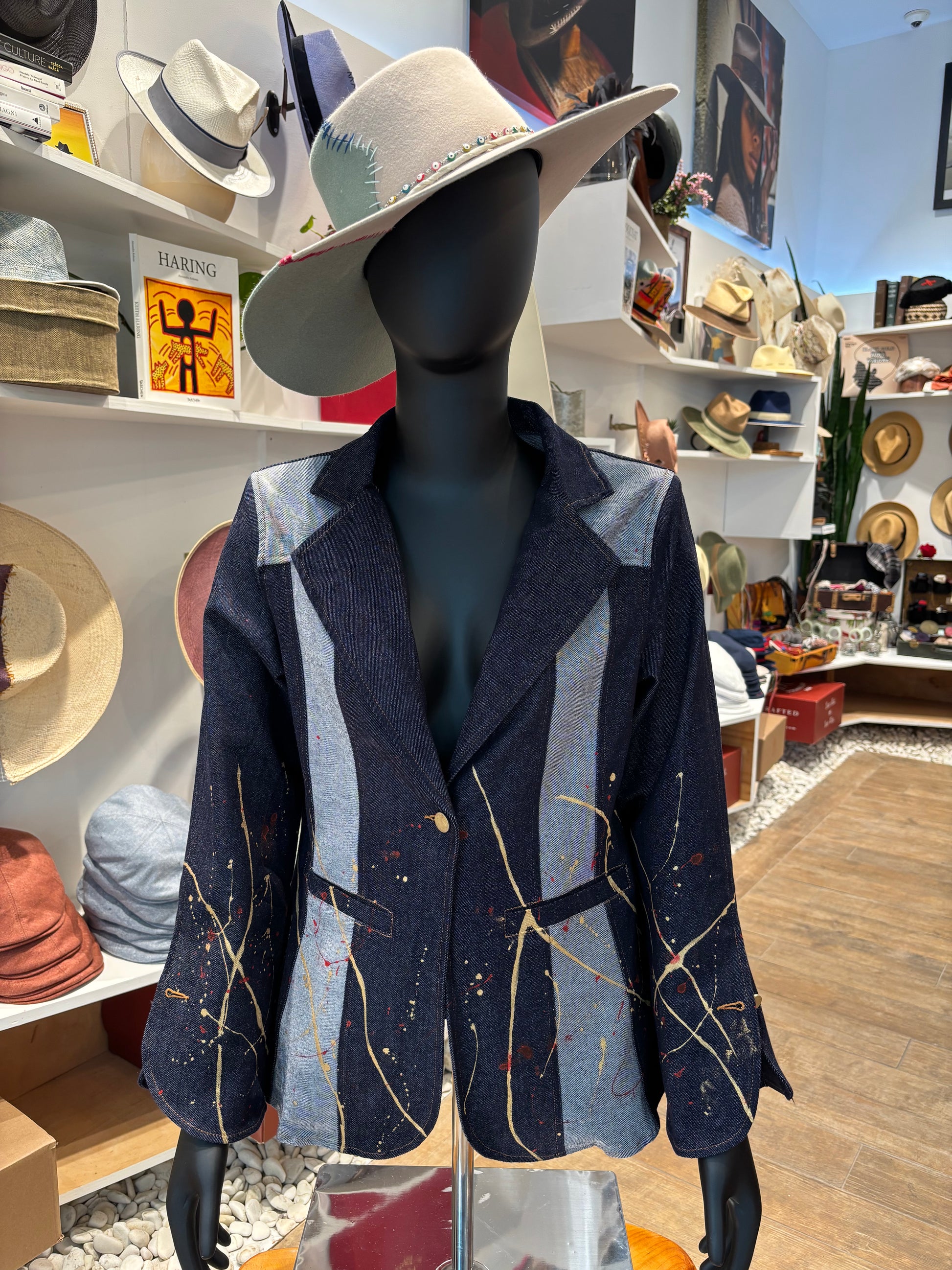 Where art meets elegance. The Muse Jacket is a true statement piece, crafted in structured denim with contrasting panels and hand-applied paint splatters that transform tailoring into wearable art. Its single-breasted silhouette, sharp lapels, and fluid sleeves balance sophistication with bold creativity. Designed for the woman who dresses with confidence and individuality, this jacket transitions effortlessly from gallery openings to evening outings. With The Muse Jacket, Mode718 redefines modern luxury—unexpected, expressive, and timeless.